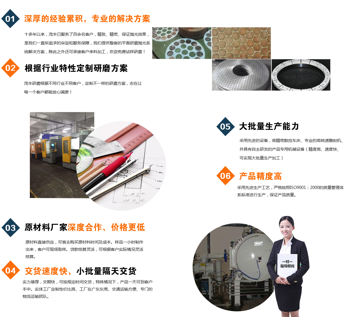 東莞市茂豐研磨材料有限公司從事精密及超精密研磨、拋光材料、工具、機(jī)械的研發(fā)、生產(chǎn),20年專(zhuān)注于提供各種平面研磨拋光系統(tǒng)性解放方案;源于臺(tái)灣二十多年豐富的研磨拋光技術(shù),研發(fā)團(tuán)隊(duì)不斷進(jìn)行技術(shù)創(chuàng)新。